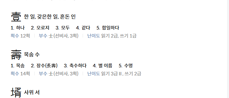입력한 글자를 기반으로 시스템이 유사한 한자를 나열합니다. 목록 중에서 원하는 한자를 선택하면 뜻, 음, 예문, 획순 등 자세한 정보를 확인할 수 있습니다.