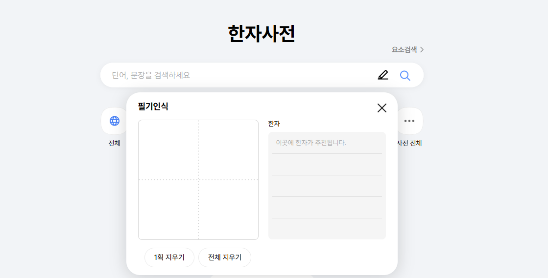 대부분의 사용자는 한자 입력에 어려움을 겪습니다. 특히 발음을 모르는 경우, 검색 자체가 불가능합니다. 이럴 때 필기인식 기능은 발음 몰라도 직접 써서 찾을 수 있다는 점에서 매우 유용합니다.