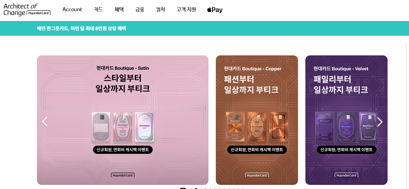 현대카드의 가장 큰 장점 중 하나는 '디자인 경영' 철학이 홈페이지에도 그대로 녹아 있다는 점입니다.