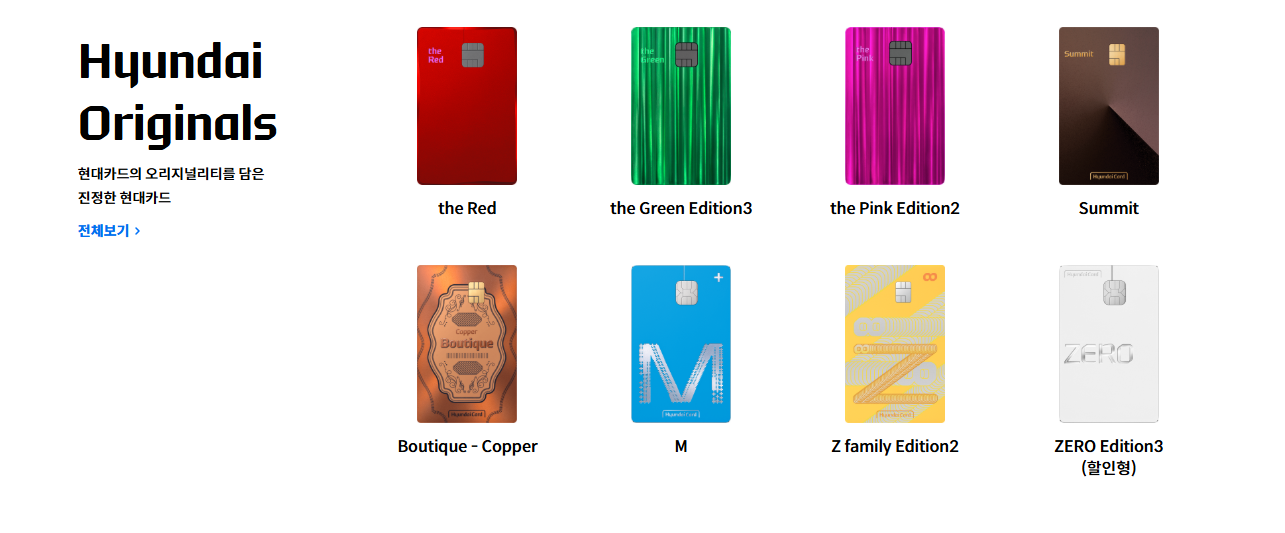 - 카드 비교: 다양한 현대카드 상품을 혜택, 연회비, 제휴처 등 기준으로 비교 가능