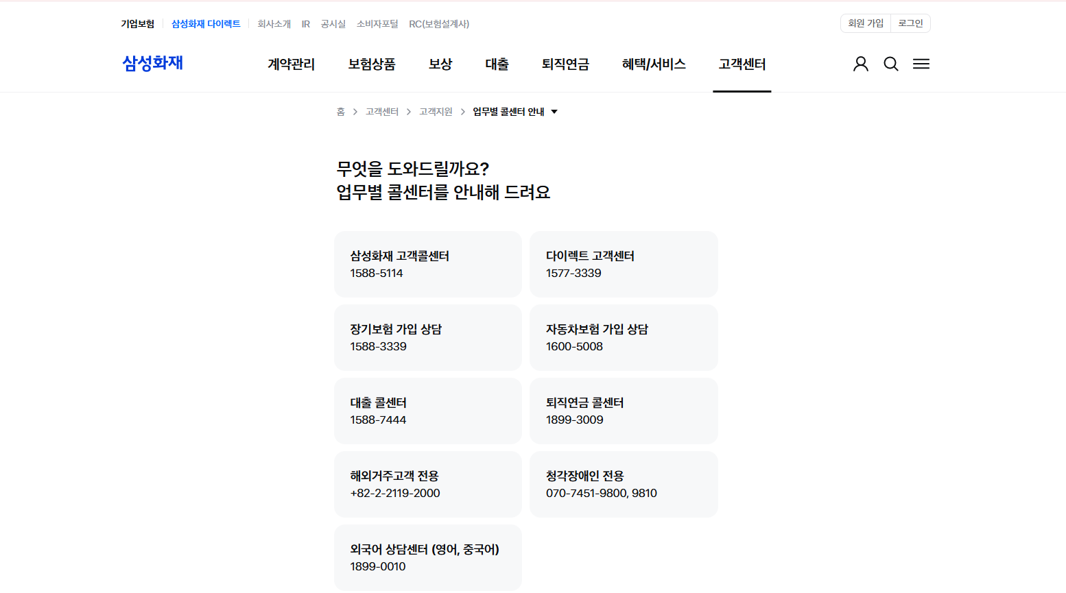 무엇을 도와드릴까요? 업무별 콜센터를 안내해 드려요 삼성화재 고객콜센터 1588-5114 다이렉트 고객센터 1577-3339 장기보험 가입 상담 1588-3339 자동차보험 가입 상담 1600-5008 대출 콜센터 1588-7444 퇴