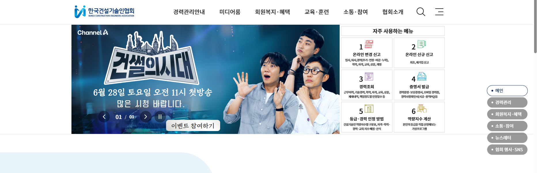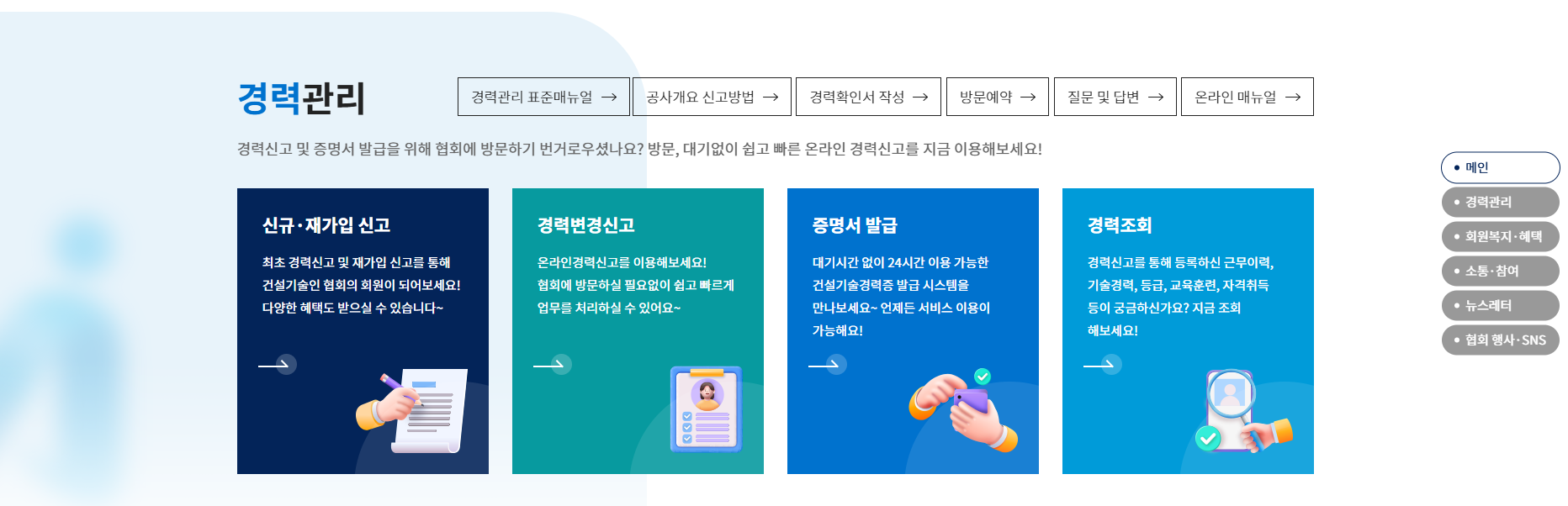 홈페이지에서는 경력신고, 증명서 발급, 교육 신청, 구인·구직 등 기술인의 실무에 밀접한 서비스들을 제공합니다.