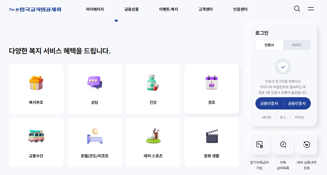 교직원공제회 홈페이지는 교직원들의 경제적 안정과 복지 증진을 위한 다양한 서비스를 쉽고 편리하게 제공하는 필수 플랫폼입니다. 회원가입부터 금융상품, 복지서비스, 각종 증명서 발급까지 모든 과정을 온라인에서 간편하게 처리할 수 있습니다. 교직원이라면 홈페이지를 적극적으로 활용하여 다양한 혜택을 누려보시기 바랍니다.