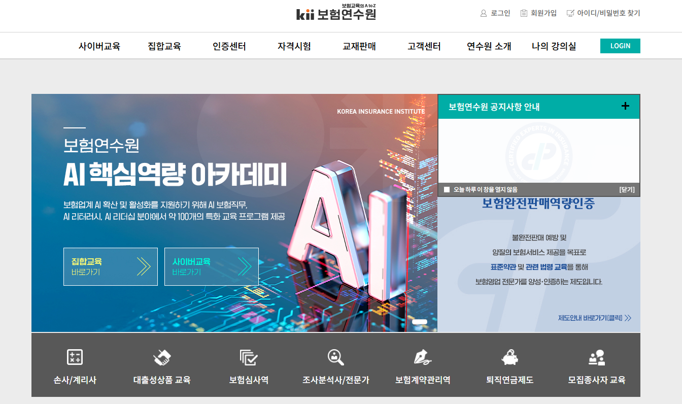 보험연수원 사이버교육 홈페이지는 전통적인 보험 교육을 넘어서 AI, 빅데이터, 블록체인 등 미래 기술과 보험업계의 융합을 선도하는 교육 플랫폼으로 발전했습니다. 60년 이상의 교육 노하우와 최신 기술을 결합하여 보험업계 전문가들이 변화하는 시대에 대응할 수 있는 역량을 기를 수 있도록 지원하고 있습니다.