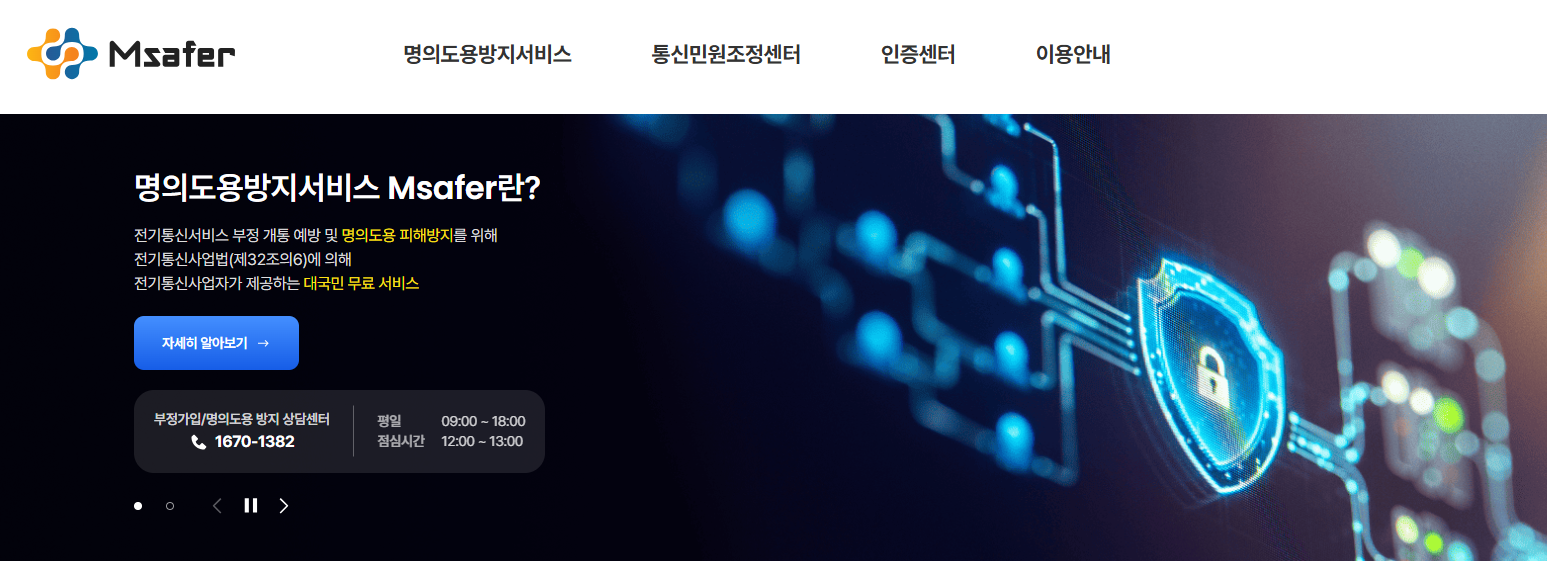 명의도용방지서비스 Msafer란? 전기통신서비스 부정 개통 예방 및 명의도용 피해방지를 위해 전기통신사업법(제32조의6)에 의해 전기통신사업자가 제공하는 대국민 무료 서비스 부정가입/명의도